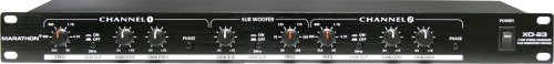 Marathon XO-23. XO-23, 2 Band Stereo Crossover has low, High Gain Control and simple frequency adjustment and separate subwoofer adjustment & gain control. A low cut rumble filter and phase reverse button. Front Panel Features: Power Switch, Phase Switch, Crossover Frequency Control, L/H Output Level Control, Subwoofer Output Level Control, Sub Crossover Frequency Control. Rear Panel Features: Fuse Compartment, Input Connectors 1/4 XLR, Output Connectors 1/4 XLR, AC Voltage Selector Switch, AC Cord. Dimensions: 19" x 5.75" x 1.73" (482 x 146 x 44 mm) / Weight: 4 lbs. (2.0 kg).